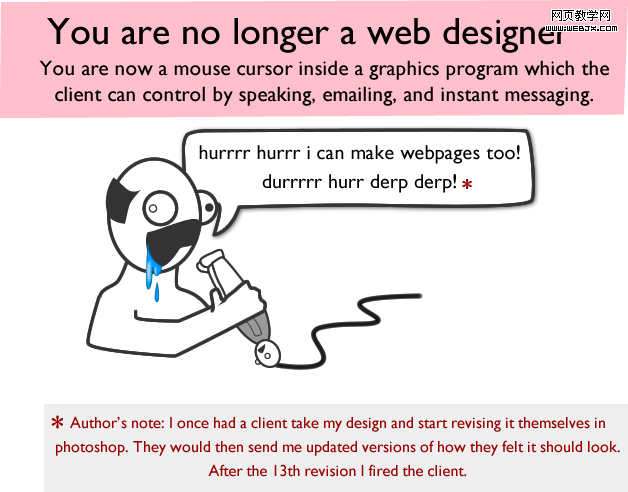 你再也不是网页设计师了。现在变成了画图程序里的鼠标,客户可以通过语音、邮件或聊天软件直接远程控制你。(译者:上面这张,画的是客户拿着设计师当笔使,我一时还真没看出来)