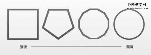 上图中我们可以看到,方形过度到圆形的变化,圆形是由极其细小的边角组成,在变化当中图形变得越来越有乐趣,比较下来圆形在几何图形中具有平滑流畅的边缘,圆形更让人感觉轻松,愉悦。设计需要增加乐趣的时候,我们可以多运用流畅线条的图形来让页面活跃起来。