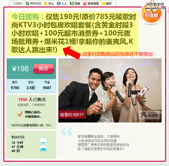 很显然,这个团购的产品设计人员,忽略了团购本身的“商品”信息的展示重点,从整个页面的设计上,仅仅突出了KTV的概念,却忽略了更细致的详细商品内容。实际上更详细的信息都在第二屏以下,然而对于Wong而言,没有任何的指示或路径,引导他进入第二屏。
