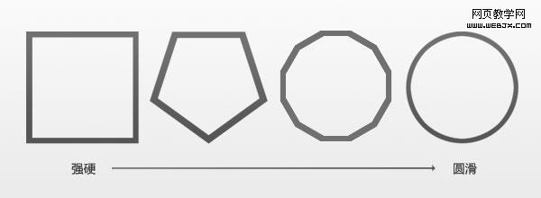 上图中我们可以看到,方形过度到圆形的变化,圆形是由极其细小的边角组成,在变化当中图形变得越来越有乐趣,比较下来圆形在几何图形中具有平滑流畅的边缘,圆形更让人感觉轻松,愉悦。设计需要增加乐趣的时候,我们可以多运用流畅线条的图形来让页面活跃起来。