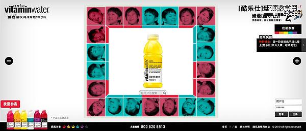 在这个页面上圆形挑起了大梁,支撑整个页面,人物笑脸图片组合的圆形包围着瓶子,映射了这个饮料带给我们的快乐。圆形不仅加强了焦点,更加强了页面的层次感,让页面不会单薄,无力度。