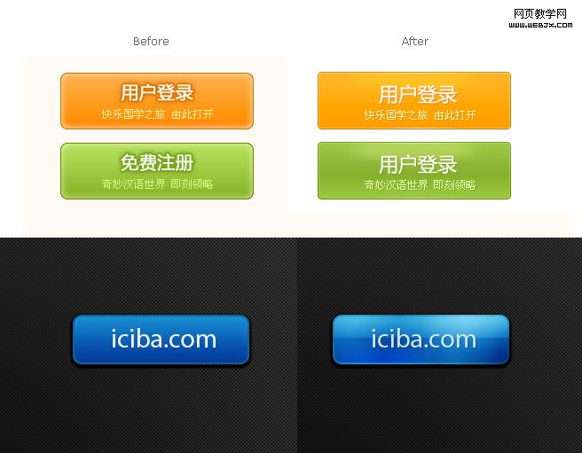 我一直信奉“细节成就完美”这句话。我觉得一个网站的品质感很大程度上取决于它的细节。这些细节体现在每一个边角、每一像素的凹凸、每一阴影的轻重、每一个间距,每一对比的感觉。如果没有很好的创意,那就多用心把每一个细节做好吧,要知道,一像素的区别就是正品和山寨的差距。一个好网站,视觉上一定要是舒服的。细节成就了网站的品质感,就像生活中你的每个点滴细节形成了你在别人眼中的形象。看看我对下面按钮做的一些改进,是否觉得改进后舒服了些。第一组按钮颜色、字体都没有变化。我只在边框、渐变、字体的投影做了微调。而效果是完全不一样。第二组我在按钮上增加了层次感,稍微的立体的感觉让用户更有点击的欲望。