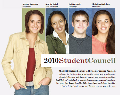 富冲击力的排版使这张学生会成员介绍的设计显得非常突出,它比普通的那种傻乎乎的团队照效果更好,因为设计师可以灵活安排其中每个人的照片,使到整体既具有一种团队的氛围,但同时又能显示出每个人的特性。使这些学生与观看的人在情感上距离更近。这样的排版另外的好处就是能够让你在版面空间的安排上更灵活,并且有更多的空间给你的放置标题及文字。