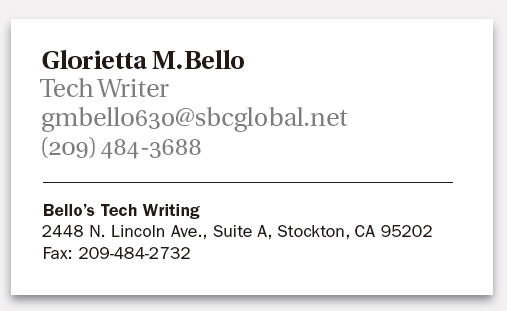 而上图,同样的信息,却是经过设计的。自信的名字及职务在白色的卡片上左对齐,突出了Glorietta本人,而不是那个了无生气的企业名称,并且该老兄是一名科技作家,有意识的排版突出了“写作”这一抽象意义。较大的文字自动传达有效的信息沟通。通过对比(大/小,衬线体,非衬线体)形成有组织、有目的的构成,传达出一种简朴的风格,但并不乏味。如果还想更引人注目,可以象下面一样更换一下颜色区域: