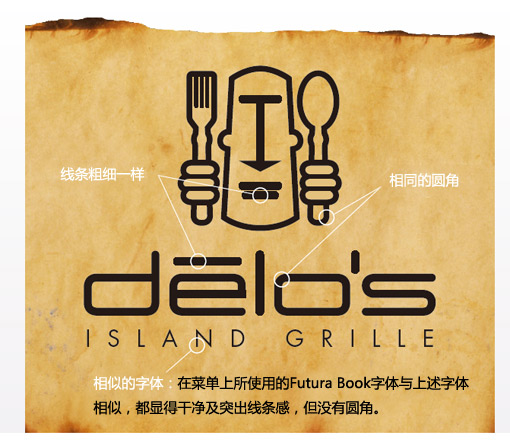 我们很喜欢DELO小岛烧烤店的菜单,因为在我们的眼中它显得很酷,它只是由黑白线条(没有灰度)构成,这些线条构成了餐厅的标志及名称。既经典又实惠的设计!