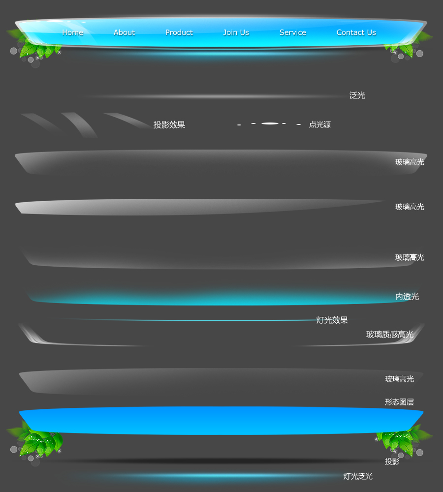我个人总是把导航的质感分为好几层,例如高光,泛光,点光,投影等,也就是基本一个实物应该具备的一些效果,把他们综合到界面上,就可以比较好的展现出界面的质感,详细请看下图!