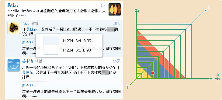 同时再来看看界面的实际情况,微博客户端的界面应该是一个中等面积的界面,每一行的内容较多,虽然只有单列,但内容非常的不一致,同时导致了每一行的高度非常的不统一。按照先前得出的结论,这样的斑马纹的颜色间隔显然是有点太弱了,间隔的点应该落在适中靠近增强边际的区域。