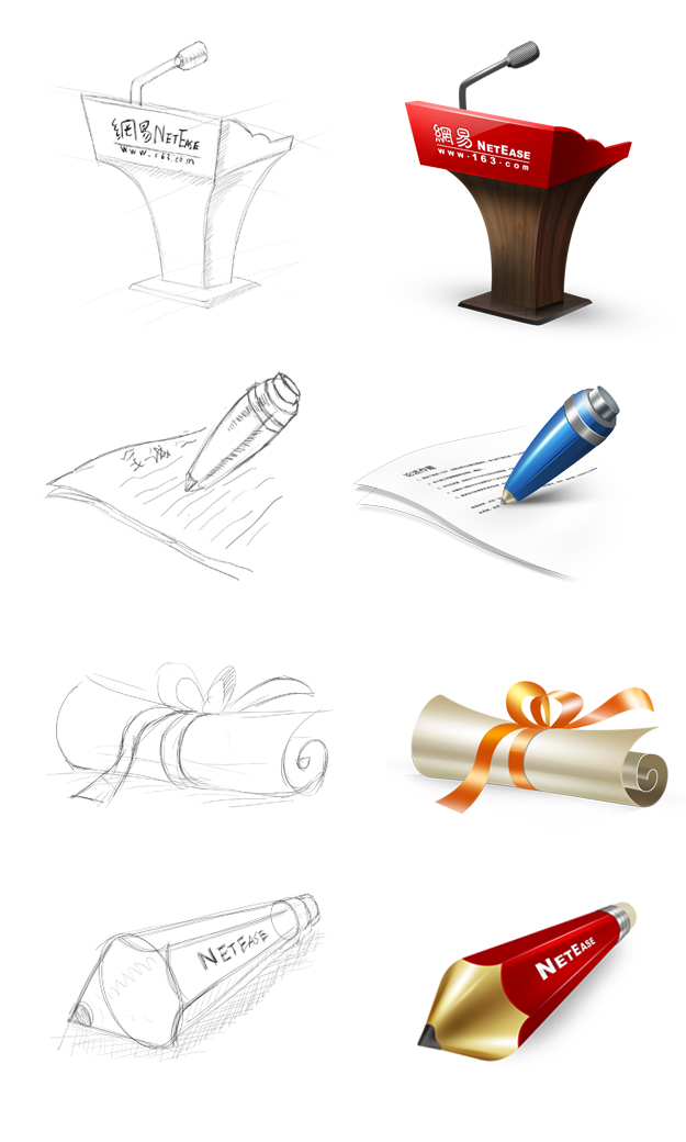 图标设计,很多人都有自己的一套方法。这里我跟大家分享一下自己的一些小经验。先来看几个线稿与最终效果图: