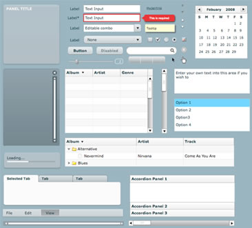 这套流程图 UI 包含 Flex 3 风格的面板,表格,按钮,链接,菜单,滚动条,手风琴式菜单,选项卡等等。