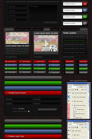 这套 Web 元素库包括 17 个模块,每个模块包含四种配色。