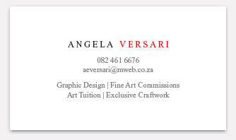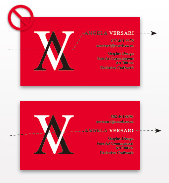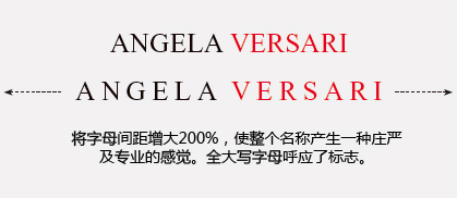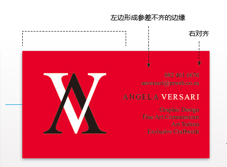 不想这么高调,那就还是把名称加上吧。名称全部为大写字母,Times New Roman字体的名称形成了一条贯穿名片的直线,同样居中。将ANGELA这几个字母设为黑色,而VERSARI设为白色,在这里,各个元素的视觉(包括字母,字体,颜色及排版)都互相得到增强。出来的效果就是“强有力及富冲击力”——我们实现了Angela的两个目标,这种排版当然也说不上是一种“花俏”或“柔和”的设计,但你倒是可以在其中感受到一些“浪漫”的气息!