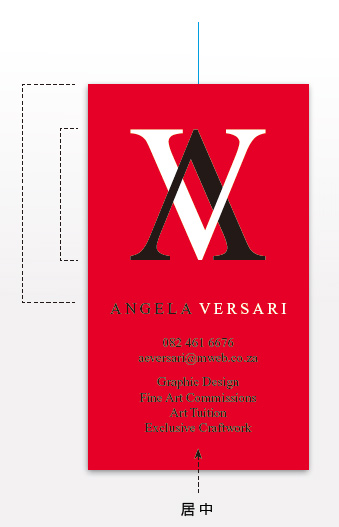 留意Angela名字的放置,我们是放在文字的中间的,而不是放上最上方。因为在这个设计中,中心线的位置力量感最强,名字放在中间位置,整体加强了名片的这条中心线的力量。