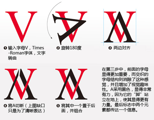 留意名称使用了Times New Roman字体,与标志完美配合,其字体尺寸较小,增强了标志的力量感及对比。再来对比一下原来的标志,白色的VERSARI与上面的字母A形成注意力的冲突。请注意,我们设计时,只需要一个焦点,才显得更有力量。这个标志中,AV这两个字母就是一个舍我其谁的主角,所有的注意力都应该从这两个字母着手。