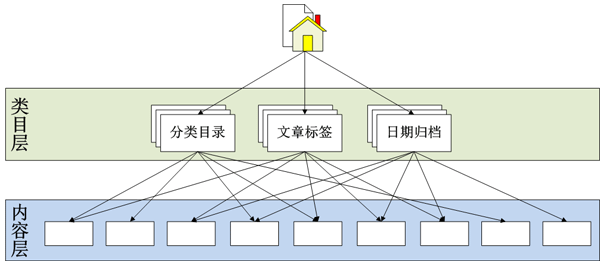 也叫树形结构,是最常见的网站信息架构模式,上面举例的Wordpress的信息架构就是典型的层次结构。树形结构中箭头的方向不一定是自上而下的,也可能是自下而上或者是双向的,而内容层之间也会因为一些关联链接的存在而存在同层次间的指向箭头。