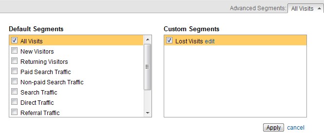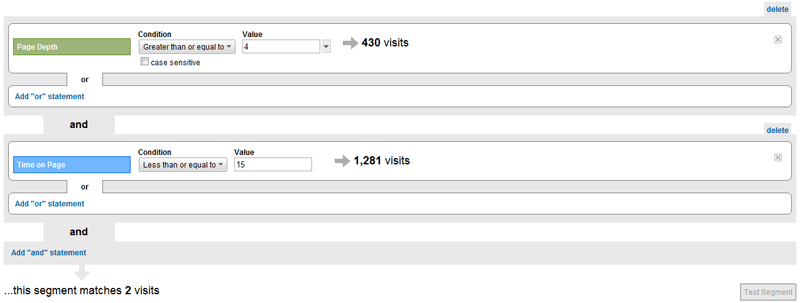 我们可以用户细分的方法把那些浏览页面数较多,但页面平均停留时间较短的用户浏览看作是迷失用户,具体的数值可以根据网站自身的特点进行定义,比如我定义我的博客中浏览页面数大于等于4,而页面平均停留时间小于等于15秒的Visits为迷失用户的浏览行为,我们可以借助Google Analytics中的高级群组(Advanced Segment)来区分出这类用户,关于如何使用Google Analytics的高级群组功能,可以参考蓝鲸的文章——Google Analytics功能篇—高级群组,如下图: