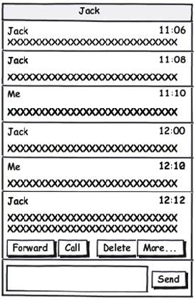 还以信息应用为例(图3),用户最关心的是信息交流,所以内容很重要,并且信息条目的分类应该是以联系人为中心去组织,因为这符合信息的自然属性(信息交流是有上下文关系的)。Android和iPhone在信息应用上都是从这个观点出发去设计,不过,我认为还可以更进一步考虑,在Android信息对话页中,用户不仅仅关心信息内容,对信息的后续操作也同样重要,因为信息呈现是为了更好地交流。现有方案中只有回复编辑框,但针对某条信息的操作还需要长按列表项,所以可在最近的那条信息底部增加快捷键(转发、呼叫、删除等),并保证页面内始终有一条信息项有快捷操作键。