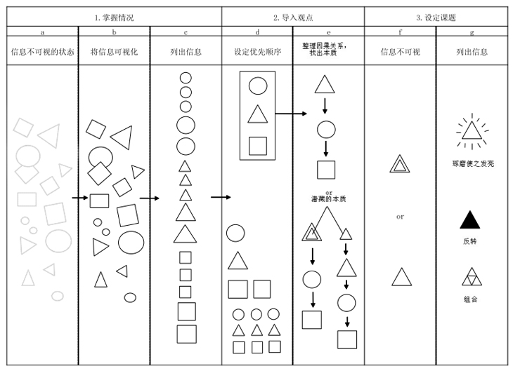 在掌握了所有信息后,就要开始排定信息的优先级,理清信息之间的因果关系。在掌握现状的阶段,各种信息呈现混乱不清的堆积状态,设计师需要将这些信息调换位置,设定优先级,舍弃冗余信息,找出信息的内在关系,整理成具有整合性的信息。这个阶段最重要,也是最难的,因为导入观点是为了找出问题的本质,如果观点没有触及到核心,那么方案就势必会有破绽。