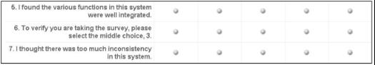 这儿有一些很好的技术来清除这些数据。鉴别(和移除)“精神骗子”并不难。这些人的行为是可以预测的。“扁平化”是指一些人的答案都是1或5,在5个等级量表中。“速度检测”是一种检测这些人(看问题6在这幅图下)的方法,确保他们确实认真阅读了每一个问题。一致性检验可以用重复词语的问题,并来分析一致性的回答。移除不切实际的任务时间也是很容易的,并能帮助处理那些在任务中间周末回家的参与者。同时,筛选问题可以写信给那些欺骗性最小的参加调研的参与者(那些伪装自己的人)。