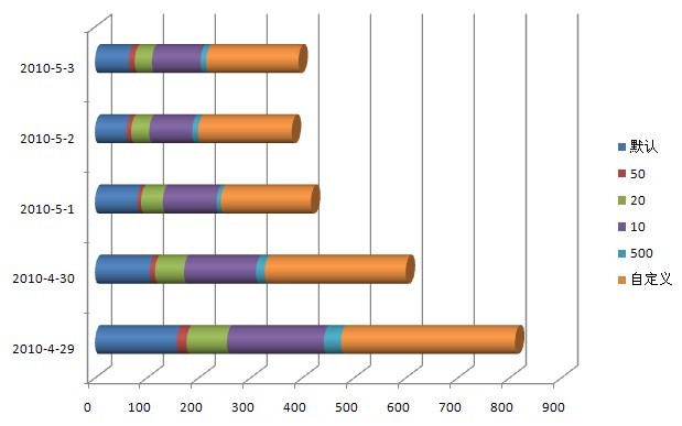 上图是截取了一部分真实数据的结果。由图标可见在捐赠笔数不断增加的几天内,自定义金额一直占据很高的比重,超过40%;默认金额只占据20%左右的比重;整体并不是完全的正太分布,选择500元的足够少,但是选择10块的人占据20%左右。