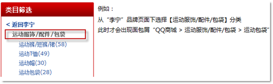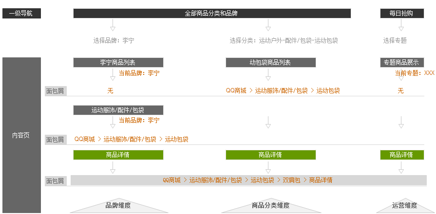 上图中我们可以发现,商品的信息结构是唯一的:即:【QQ商城 > 运动服饰/配件/包袋 > 运动包袋 > 双肩包 > 商品详情】,分析三个浏览维度的面包屑表意: