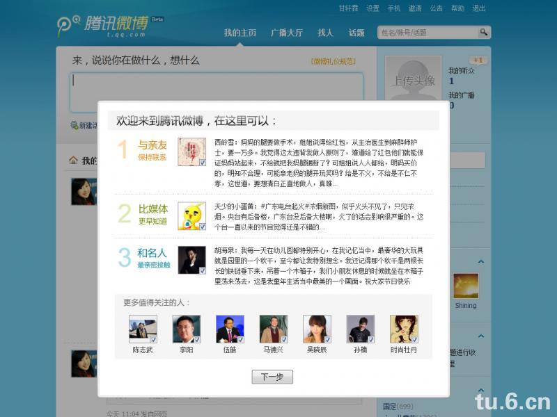 我觉得这样的形式比单独的页面更好,单独的页面引导结束之后,会让用户被迫接受另外一个陌生的页面——首页。而腾讯微博这样的形式,让人明白现在是在首页,但我对你有一个引导,让用户对首页没有陌生感。