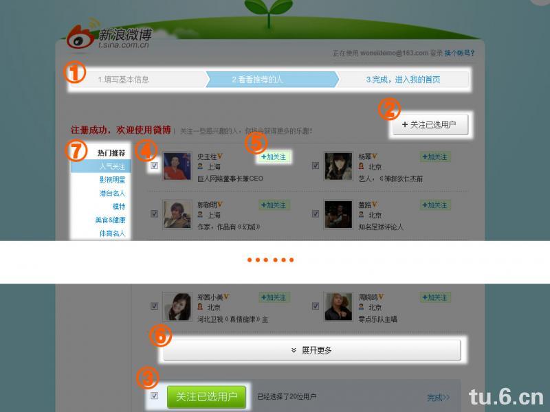 ② 系统默认勾选了“人气关注”第一页的全部人物(20个),在进度条的下方的右侧功能区就放置了添加所有勾选的人为关注的按钮,针对没有耐心仔细筛选的用户比较方便。