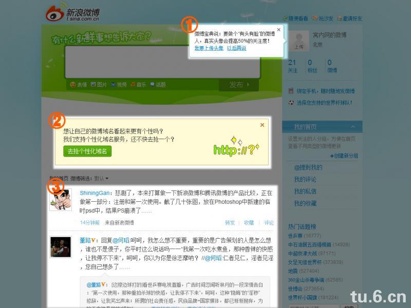 ① 和 ② 分别:说明了微博的作用(主题),显示了最新名人的微博信息。在左侧,也许是因为把主题和具体内容混在一块儿,让我感觉这是不太会被注意到的区域。