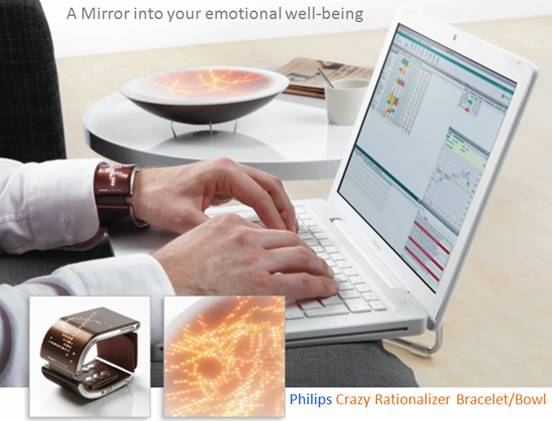 用户对健康的需求是非常高的。这里的健康不仅仅是医学上的,更包括健康的生活方式。而常常,人会忽略甚至习惯许多对健康有负面影响的行为。这样的行为,作为产品设计方来说,是不可以忽略的。就像现在很多的软件会在用户使用电脑时间过长的时候提醒休息。人因学中也包含很多有利于人体健康的产品设计的考虑。同样,我们知道,人的情绪对健康也是有很大影响的。正是看到了这个潜在的用户需求,飞利浦设计了一个情绪检测和合理化手镯(Rationalizer Bracelet/Bowl)[11]。这个手镯可以通过检测用户的皮肤、血液、温度等参数,获得用户此刻的情绪(平静、焦虑等),从而提醒用户是调整此刻的心情,以免对健康产生慢性危害。