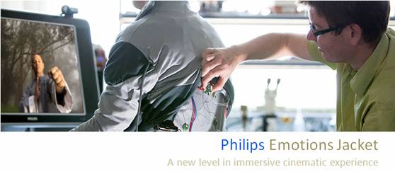 我相信,很多用户都会希望在安全的环境下去体验自己不可能体验到的一些场景。这一点在互联网游戏设计中表现更加明显。因为这带来的不仅仅是娱乐,更是一种仿真性的体验需求。体现出人对事物的好奇心理与探险体验心理。所以正是基于这种用户心理需求,飞利浦设计了一个感知体验夹克(Emotions Jacket),穿上这样的夹克,用户就可以选择电影中的人物,并且能够拟真体验到电影人物的感知和行为。