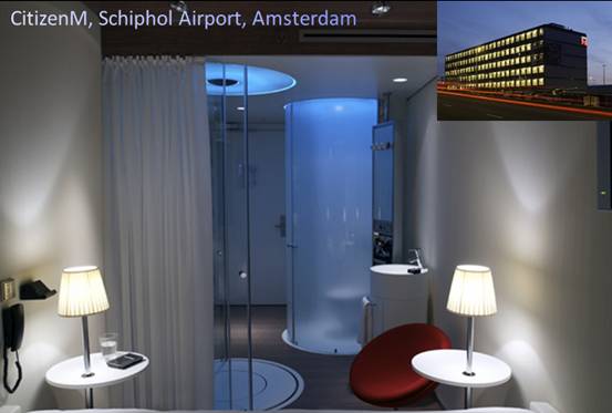 智能一直以来都是近代科技发展和产品设计中的一条主线。在生活中,用户的声音往往是:“这东西能不能做的更加智能些,能不能自动的实现(某种功能)呢”。在我们的产品设计中,同样会有类似的声音。智能其实也包含了用户对易用性、方便性、有效性等方面的综合需求。飞利浦智能酒店(Intelligent Hotel)[9] 的设计就是基于这样的需求的,从概念上房间的功能是非手动的,例如当你靠近窗口的时候,智能系统根据你所站的方向和穿着等特征判断你是否想打开窗帘;若判断为是,那么窗帘会自动的打开。现在,智能酒店仍然处于概念设计中,在不远的未来将会实现。下图中位于Amsterdam Schipol机场的CitizenM酒店就是智能酒店的概念雏形。
