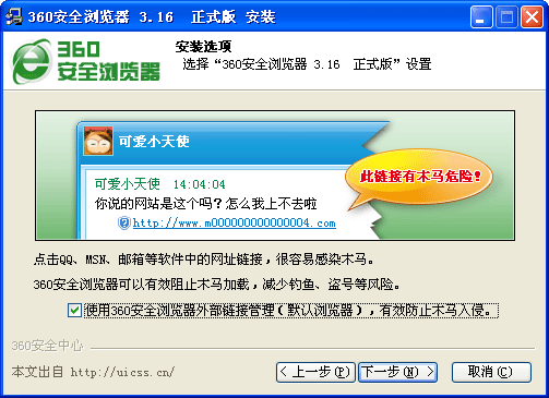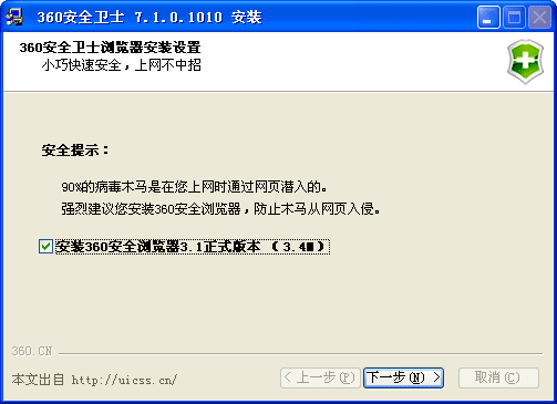 一个无法点击的“取消”按钮,一句“90%的病毒木马是在您上网时通过网页嵌入的”,紧跟着“下一步”的“360安全浏览器可以有效阻止木马加载,较少钓鱼、盗号等风险”: