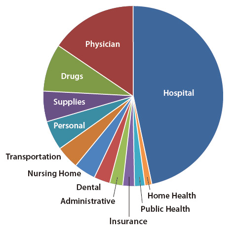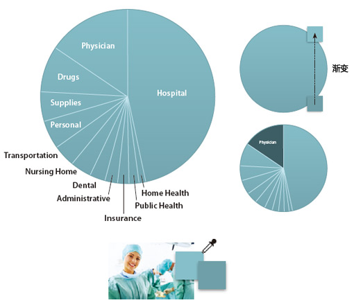 修改前:修改前的这种幸运轮式的颜色设计,虽然让每一个数据都分得清清楚楚,但同时也带了太多的嘈音。因为颜色在这里明显用得太多了。每一种颜色代表不同的数据,反而使整个图片让人无法卒读,而且在这个设计中,还会产生误导。其实里面全部都只是医疗费用支出。
