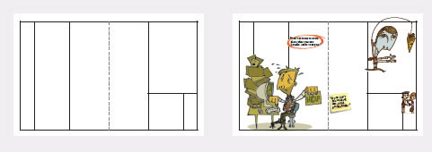 插入“障碍元素”是一种能够使版面显得很有生气的技巧。一般我们在开始时以网格及参考线定下文字放置版式(上左)。然后将各种元素加进去并且与这些栅格线重叠(上右)。在这些例子中,几个图片元素使文字形成包围状。而“办公用品”风格的引言则可以根据版面实际情况灵活变宽或变小。