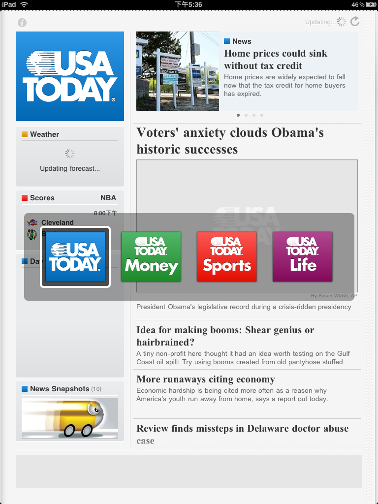 USA Today 使用了最后一种设计:如果你点按报纸的标识,它会弹出一张导航菜单,里面列有报纸的各个版块。这可能是我们测试过的交互设计中最令人意外的一项,没有一个用户想到会是这样的。