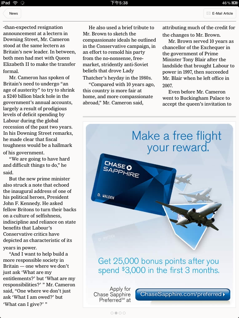 - 用手往左滑动页面(这有时会把你带到「下一篇文章」,而不是同一篇文章的下一页)。不过这一手势也有问题,比如在《纽约时报》的 iPad 版里,当一个区域被广告挡住时,往左滑动就不管用了。