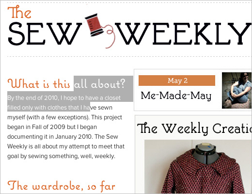 The Sew Weekly : 使用 Typekit 嵌入式字体技术,使用的全是衬线体 skolar-1,skolar-2, Georgia, Times, serif,文字还分栏了,似乎又是一种潮流。
