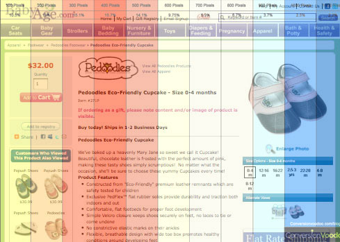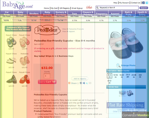 这个发现很让人吃惊,因为貌似99.9%的电商网站都把(加入)购物车按钮放到右边,你原以为用户已经被”教育”的会在那个位置找”购物车”按钮.但是根据Jakob Nielsen最近那篇发现在水平方向上,注意力分布更靠左边的研究报告,BabyAge的这个测试结果又好像不那么意外.
