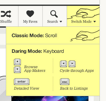 They Make Apps : 几个月前,他们有一个键盘导航模式,使用箭头在内容之间穿梭,回车键展示细节内容,Escape 键返回主页面。但不知何故,键盘导航功能现在已经去掉了。