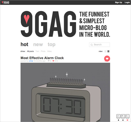 9GAG : 一个社会化图片书签站点,按 j 和 k 前进或后退,使用 l 键为当前图片投票。