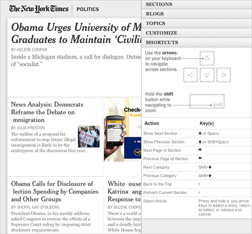 NY Times: Times Skimmer : 纽约时报的新闻概要页拥有很好的键盘导航功能,使用箭头键在新闻间前进后退,使用 Shift 键缩放,返回顶部按 t,刷新当前内容按 r,选择新闻按 a 和箭头。