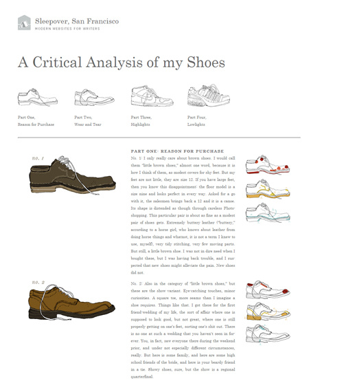 Sleepover: A Critical Analysis of my Shoes : 简单的网格布局,文字左右对齐,图片也漂亮,不过左右对齐式文字在 Web 上似乎不怎么行得通。