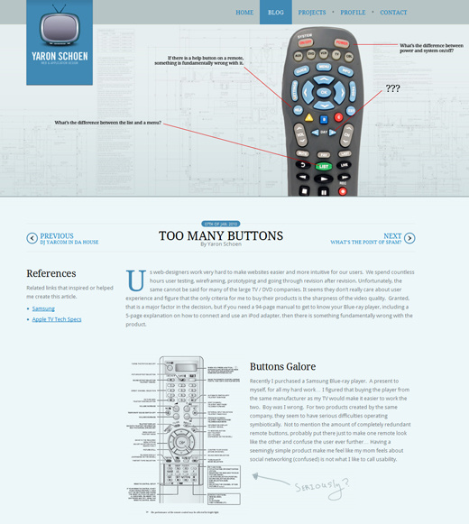 Yaron Schoen: Too Many Buttons : 平面设计化的 Web 页面需要更多东西,背景图片与配色,CSS 式样,这个示例说明了这些。