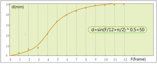 d表示距离,总大小是屏幕的宽度。F是帧数,按30fps这个过程大约0.4秒。我们可以看出,趋势上是一个先加速后减速的过程,它的背后定对应某一函数曲线,而一般这种运动曲线可以应用三角函数sin实现,但这里它更像是sin的平方根(这个猜测应该不准确,还请了解iPhone SDK的同学指正)。