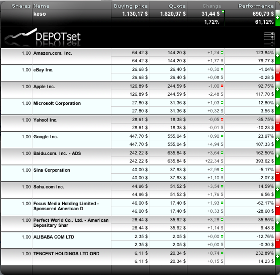 总共13只股票,各买一股,总投资1130美元。截至今天,其中8只股票比两年前价格上涨(按涨幅排序,依次是腾讯、百度、亚马逊、苹果、完美时空、 Google、搜狐、微软),5只股票下跌(按跌幅排序,依次是分众、雅虎、阿里巴巴、新浪、eBay)。但现在这些股票的账面价值是1821美元,我两年净赚691美元,回报率达到61%。