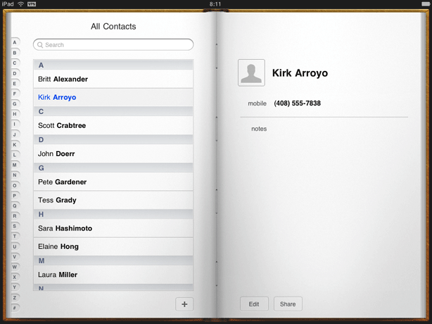 列表(也就是表视图)在iPhone中常用于显示大量的数据信息,在iPad也是非常有用。但是还可以使用一个更丰富的方式来显示同样的信息。例如:iPhone中的联系方式是一个很有效率的列表。而在iPad中的联系方式看起来是一个美观的通讯录,iPad的列表可以显示更多的信息。