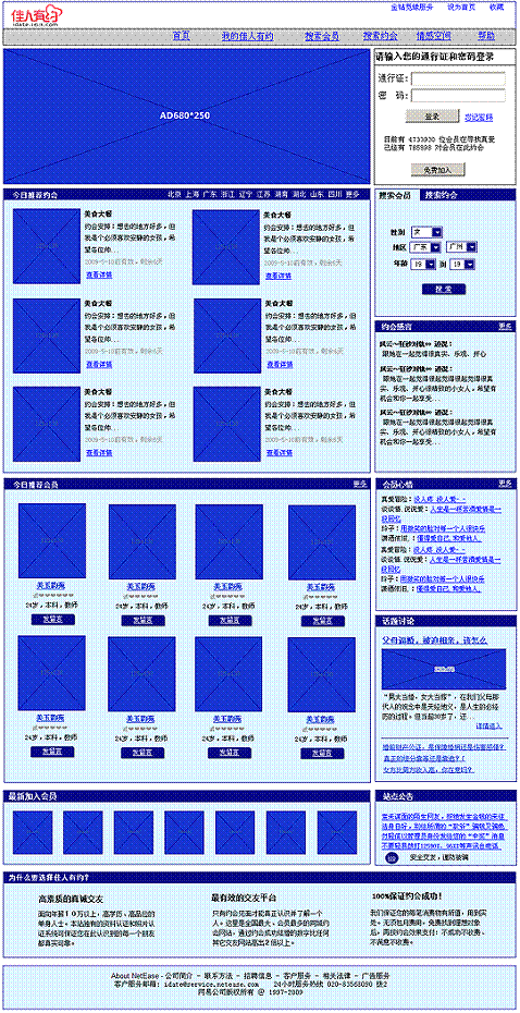 整体结构就是传统交友网站,其中一个小问题是没有体现出交友的约会特色和品位定位,并没有区别于国内的其它交友网站。于是做了些尝试,结果如下。