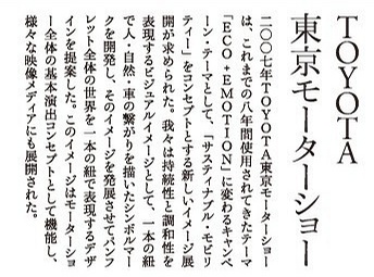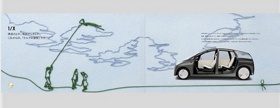 之前我想先让大家看一下早在07年丰田在东京车展 2007年丰田东京发动机展,将sustainable(对自然资源和能源的利用)不破坏生态平衡的,合理利用的 机动性代替了至今为止持续8年使用的 ec +emotion主题树立了一个崭新的概念, 我们尝试用一颗纽扣将人,自然,车的关系进行刻画所设计的新图标将持续性,调和性以视觉印象形式予以表达。将该印象延伸发展,决定宣传册全体用一颗纽扣来进行表现作为我们的提案。此概念在全体车展中作为基本概念为我们使用的同时,也将出现在各种各样的映像媒体中。