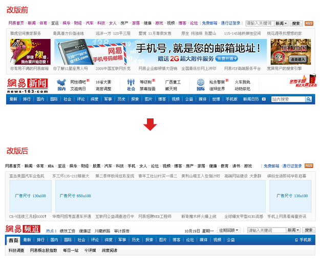 先说明一下,在此次改版之前的上半年,已经进行过一次对网易首页和频道首页的整体改版,这次改版为上次改版的优化设计。主要针对: