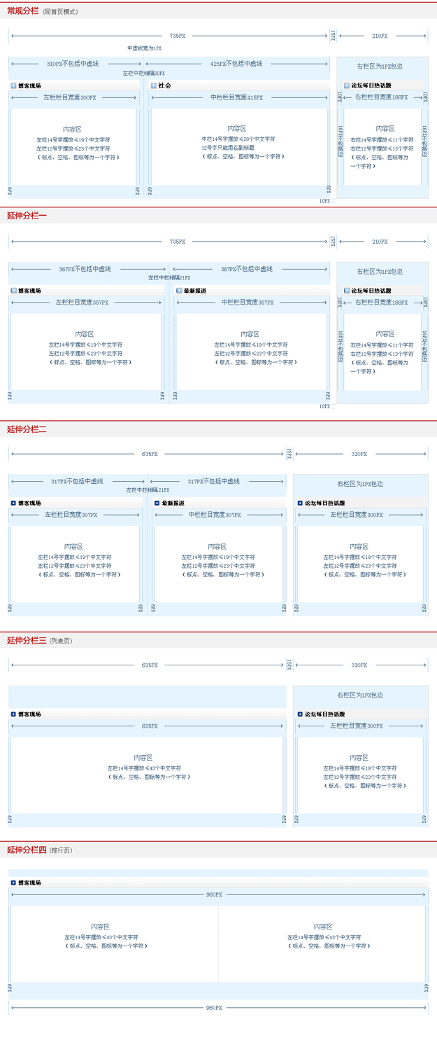 这些延伸的布局样式基本涵盖了所有网易二级页面的需求,二级页面可以比比首页灵活一点,如排行页、列表页等都可以根本不同的情况需求,在使用这些延伸的布局。这些也可以严格控制编辑胡乱编排布局。