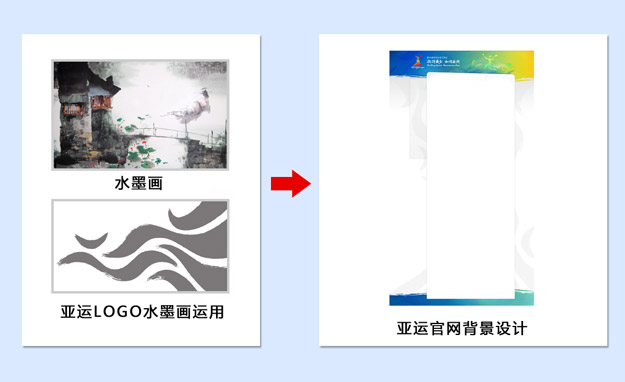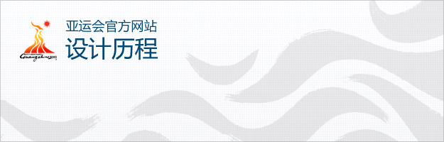 新版设计中的一个核心就是页面的特色,不仅仅是中国的特色,还有亚运的特色。而中国的水墨在奥运中的成功运用,也让这一元素更加的具有了国际化特性。设计之初,底部背景是运用了具有运动特色的大面积水墨效果,之后才修改成了经过水墨化处理的亚运LOGO,这样可以更加的契合亚运的主题,将背景也与亚运VI进行了关联。